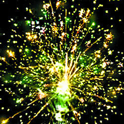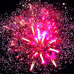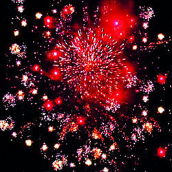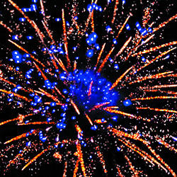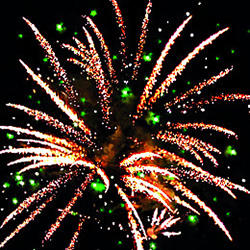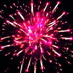 Белые хвосты, красное, зеленое мерцание и облако трещащих разрывов. Сиреневые звезды с белыми хвостами и зеленое мерцание. Красное мерцание и облако трещащих разрывов. Синие звезды и белые ниспадающие нити.