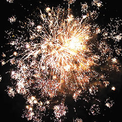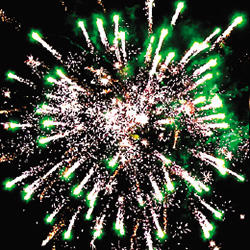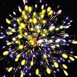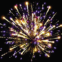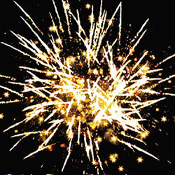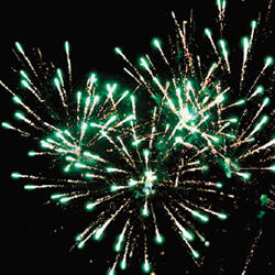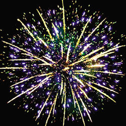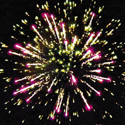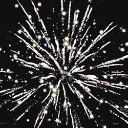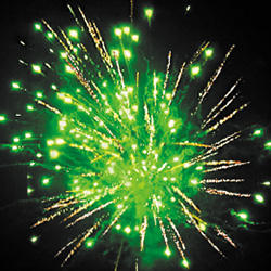 4. Выстреливает подряд: Желтые звезды с пышными хвостами (кокос) и синие звезды. Зеленые звезды с пышными хвостами (кокос) и облако треска (трещащий дождь). Множество серебряных ниспадающих нитей (парча) и белое мерцание. Красные звезды с пышными хвостами (кокос) и облако треска (трещащий дождь).
