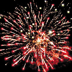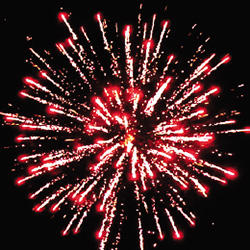 8. Выстреливает подряд: Красные звезды с пышными хвостами (кокос) и облако треска (трещащий дождь). Желто-синяя сфера (пион).