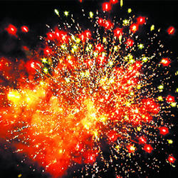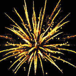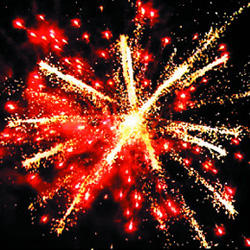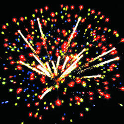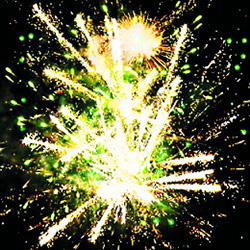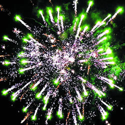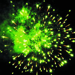 8. Красочная концовка. 2 уровня: Внизу - треск. Вверху - красно-зеленая сфера (пион) и облако трещащих разрывов (трещащая хризантема).