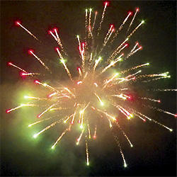 5 эффектов. Разноцветные кометы разрываются сферами из: оранжевых и зеленых мерцающих огней, красных и белых мерцающих огней, серебряных форсов с красными и зелеными огнями на концах, серебряных искристых форсов и зеленых огней, красных и трещащих огней.