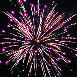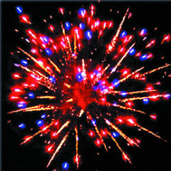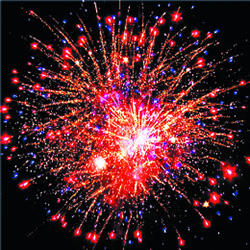 7. Красочная концовка: Множество серебряных ниспадающих нитей (парча), красно-синяя сфера (пион) и облако трещащих разрывов (трещащий дождь).