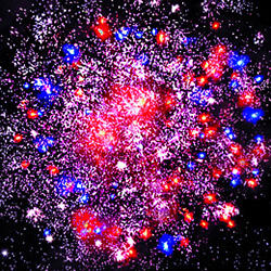 5. Множество серебряных ниспадающих нитей (парча), красно-синие звезды и треск.