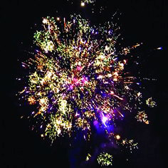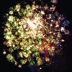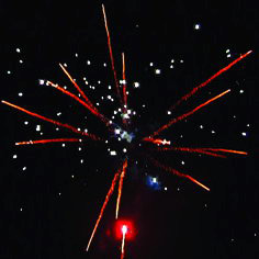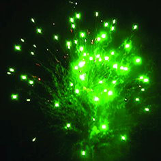 Цветные звезды разрываются сферами золотых хвостов с красными звездами, сферой зеленых звезд и золотыми мерцающими звездами, золотыми кометами, облаком трещащих искр, золотыми кометами с белым мерцанием. Залп зеленых звезд разрывается облаком золотых трещащих искр с фиолетовыми звездами.