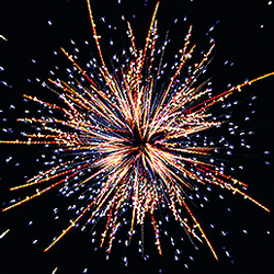 3. золотых форсов и множества трещащих сфер. 4-й блок "Цвет, треск и турбиллионы". Разноцветные кометы, спиралеобразные искристые трассы разрываются сферами из: