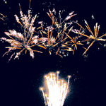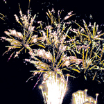 Двухуровневый салют: верхний уровень разрывается золотыми искрящимися хвостами, трещащими искрящимися сферами, нижний уровень разрывается золотыми или трещащими букетами.