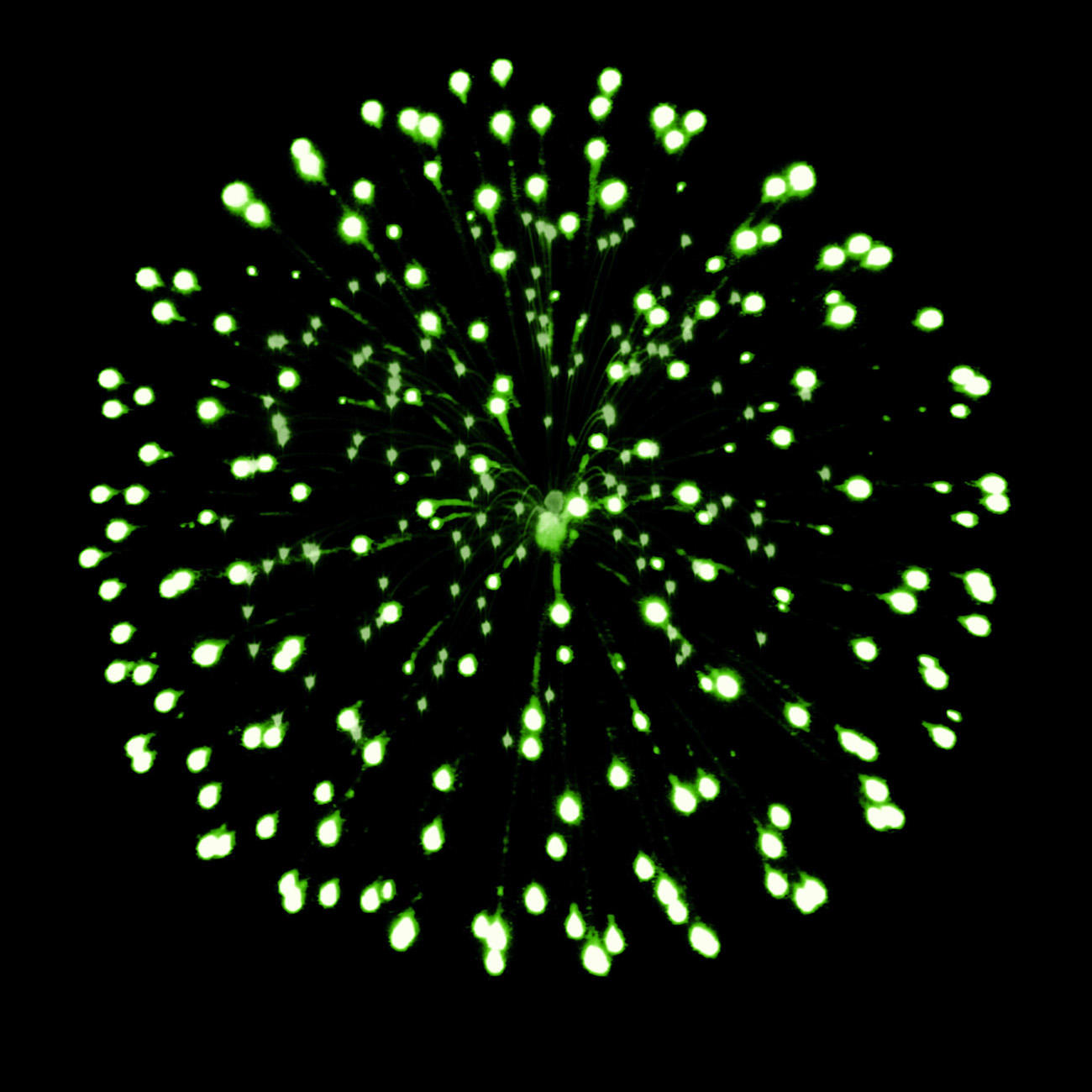 Веер из серебряных искристых трещащих трасс с зелёными кончиками