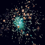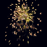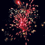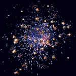 Мощный поток красных, желтых и синих комет разрывается красочным салютом на фоне серебряных трещащих облаков с золотыми мерцающими звездами.