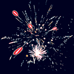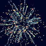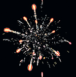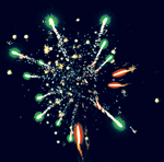 Разноцветные кометы разрываются золотыми пальмами с яркими красными и зелеными кончиками на фоне серебряных и золотых трещащих звезд.
