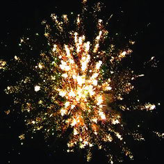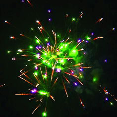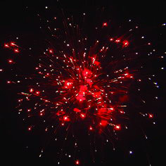 Цветные звезды разрываются большими красными звездами и сферой золотых комет, облаком трещащих звезд, большими зелеными, фиолетовыми, серебристыми мерцающими звездами. Залп золотых звезд разрывается большими красными звездами и золотыми кометами с мерцанием.
