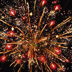5. Сфера золотых хвостов с переходом в красные звезды (цветная хризантема) и облако треска (трещащая хризантема)