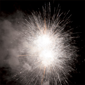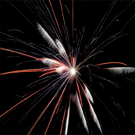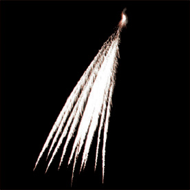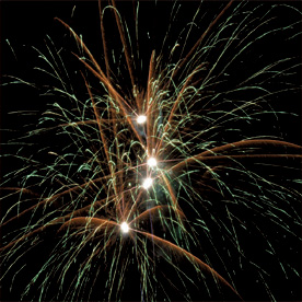 Разноцветные кометы разрываются сферами из: красных, белых, синих и золотых мерцающих огней; синих огней и золотых форсов; зеленых мерцающих огней и золотых форсов с разлетающимися шуршащими искрами. Падающие букетики из ослепительно белых мерцающих огней; яркие белые сферы с громкими хлопками.
