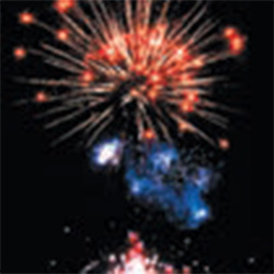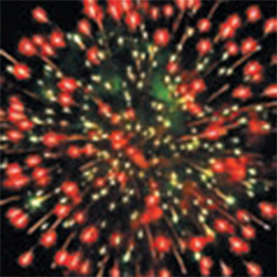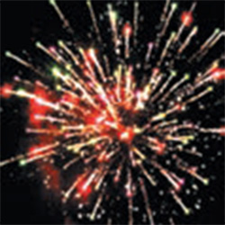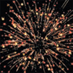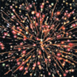 9 эффектов/: 1-2. Выстреливает подряд: Множество серебряных ниспадающих нитей (парча) с красными звездами на концах и золотое мерцание. Сфера золотых нитей с переходом в красно-зеленые мерцающие звезды (мерцающая хризантема).