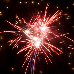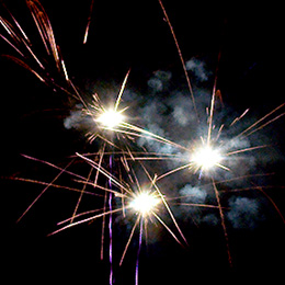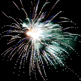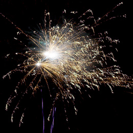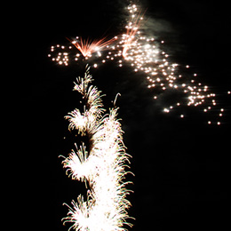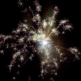 Серебряные мерцающие хризантемы, большие золотые пионы и блуждающие звезды, новые эффекты: «Бешеные пчелки» и «1000 хризантем», залп в виде огромных золотых пальм.