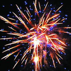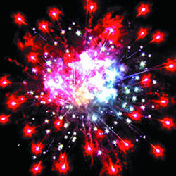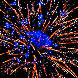 1. Комета разрывается красно-белой мерцающей сферой (пион).