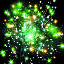 4. Комета разрывается золотыми звездами с пышными хвостами (кокос) и синие звезды.