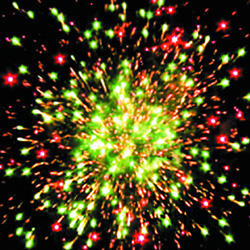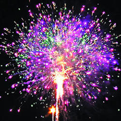 6. Красочная концовка. ЗАЛП: красно-зеленая сфера (пион) и облако трещащих разрывов (трещащая хризантема).