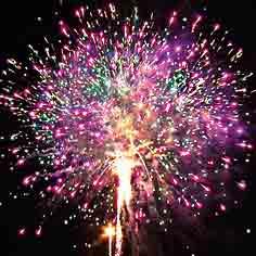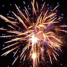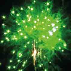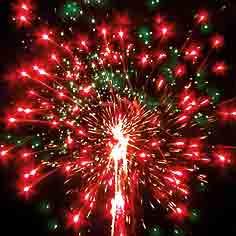 Сфера красных звезд с зеленым мерцанием. Синие, зеленые, фиолетовые звезды с треском и золотые хвосты. Множество разноцветных звезд и облако трещащих разрывов.