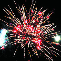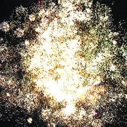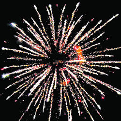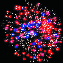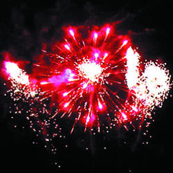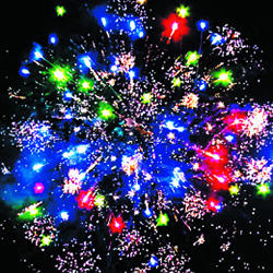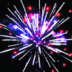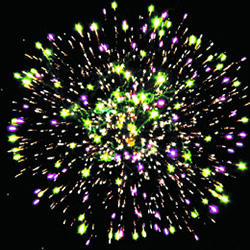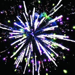 4-5. Выстреливает подряд: Комета разрывается множеством серебряных ниспадающих нитей (парча) и красно-синими звездами. Комета разрывается множеством серебряных ниспадающих нитей (парча) и зелено-фиолетовыми звездами.
