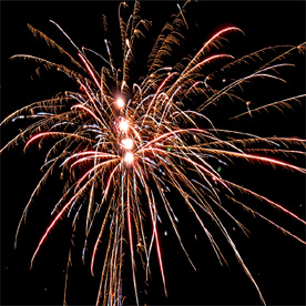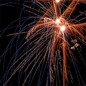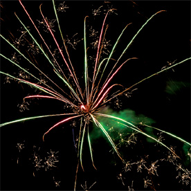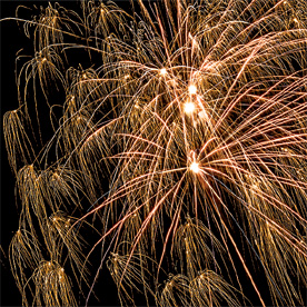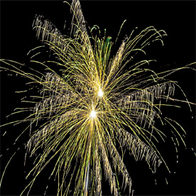 Комбинированная батарея салютов 66 зарядов калибром от 20 до 30 мм. Разноцветные кометы разрываются сферами из: синих и белых мерцающих огней, зеленых и трещащих огней, фиолетовых и зеленых мерцающих огней, оранжевых огней и шуршащих разлетающихся искр, красных мерцающих огней и золотых форсов (залп), синих огней с золотыми форсами (залп), серебряных форсов с трещащими разлетающимися искрами, красных и зеленых огней (залп), крупных фиолетовых огней и золотых форсов с шуршащими искрами (залп).