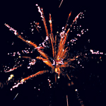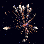 Множество золотых нитей поднимаясь от земли разрываются золотыми хризантемами с серебряными мерцающими хвостами на фоне ярких синих звезд.