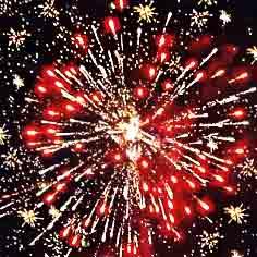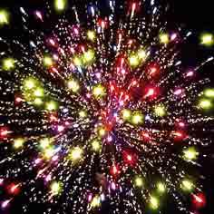 Красные, зеленые , золотые, синие звезды с белыми мерцанием. Залп синих, красных, зеленых звезд с белым мерцанием. Красные звезды с золотыми трещащими разрывами.