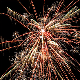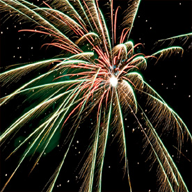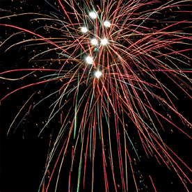Разноцветные кометы разрываются сферами из: красных, зеленых и белых мерцающих огней; зеленых огней с серебряными форсами и красных огней; красных огней и множества трещащих сфер.