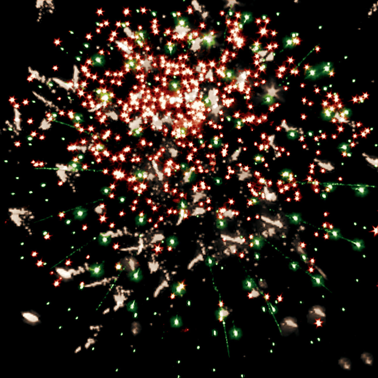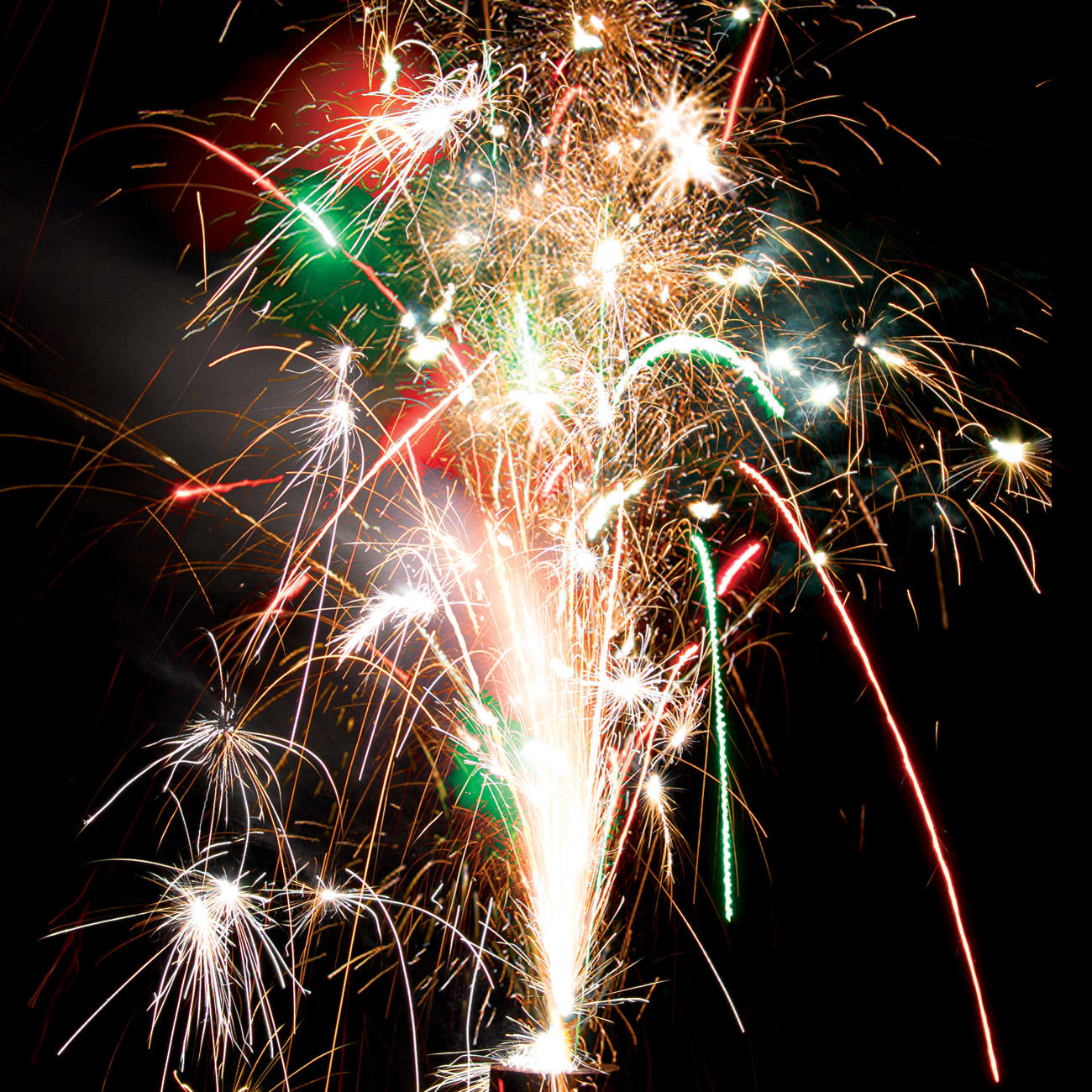 Фонтан из трещащих серебряных искр с красными и зелёными огнями