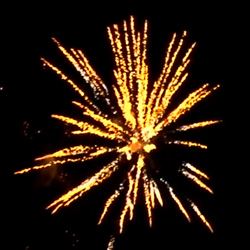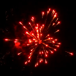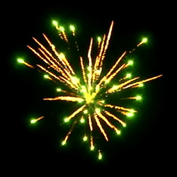 4 эффекта. Чередующиеся разрывы из букетов: 1. красные огни и разлетающиеся золотые форсы; 2. зеленые огни и золотые форсовые трассы; 3. множество золотых нитей; 4. золотые форсовые трассы.