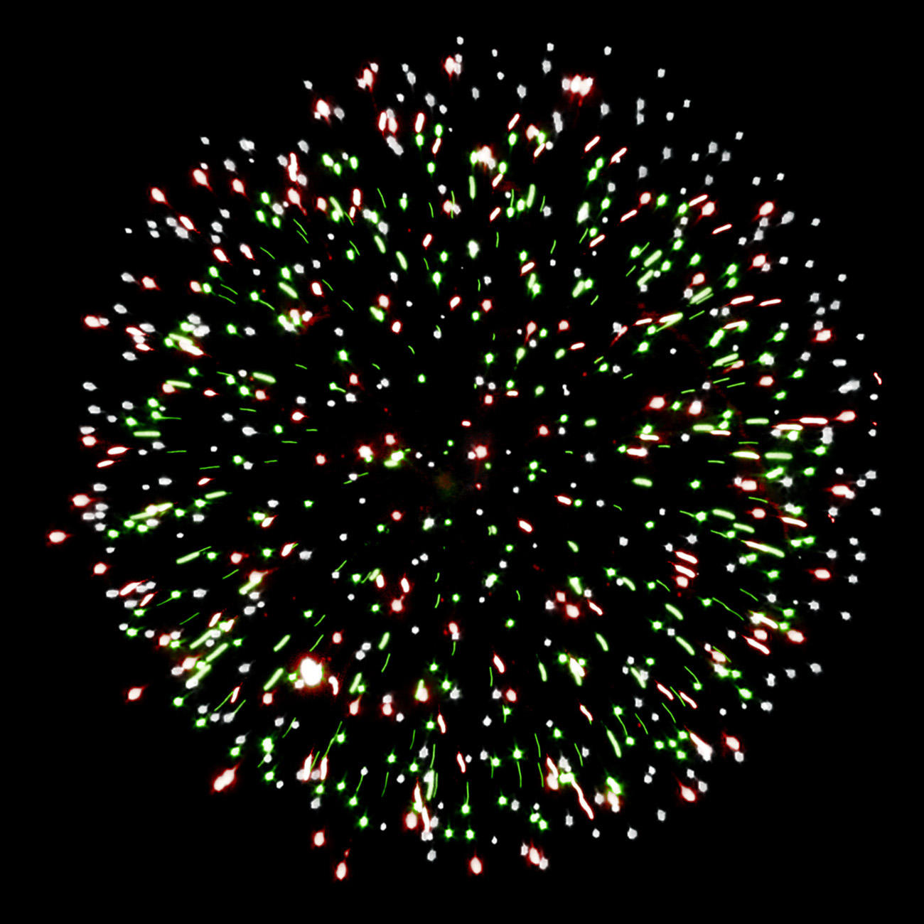 1. Поток красных, зеленых, серебряных трещащих разлетающихся огней. Верхний уровень - салют: Разноцветные кометы разрываются сферами из: