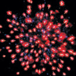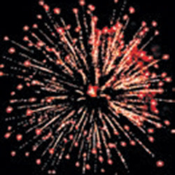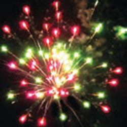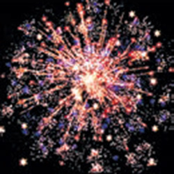 Красные и синие звезды. Красные звезды с золотыми хвостами. Зеленые звезды с розовым мерцанием. Синие звезды и облако трещащих разрывов.