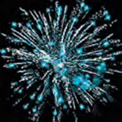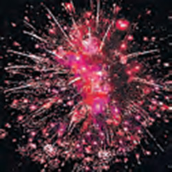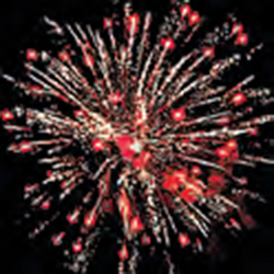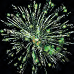 Разноцветные кометы разрываются сферами из: красных огней и серебряных форсов; зеленых огней и серебряных форсов; синих огней и серебряных форсов; красных огней с серебряными форсами и трещащих огней.