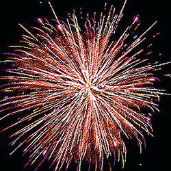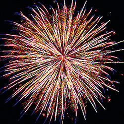 1 эффект. Золотые искристые трассы разрываются сферами из: золотых искристых форсов, синих, фиолетовых и золотых мерцающих огней.