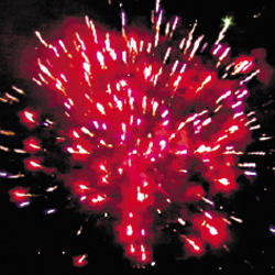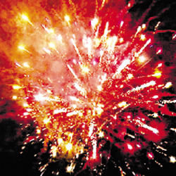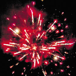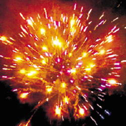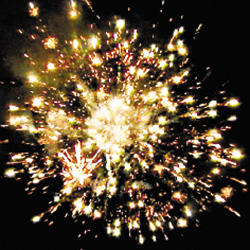 2. Трещащая комета разрывается белой мерцающей сферой (пион) и треском.