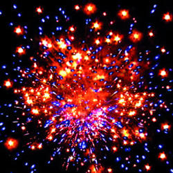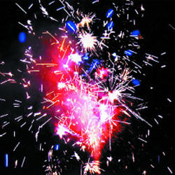 1. Фонтан: Красно-синие звезды и треск. Выстреливает салюты: