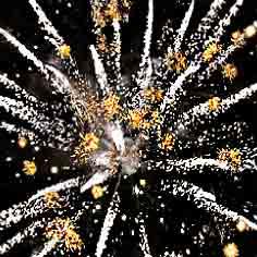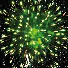 Красные, синие и зеленые звезды с золотым мерцанием. Красные звезды с треском. Серебряные шуршащие хвосты и треск.