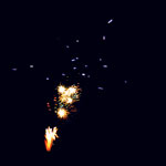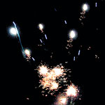 Взлетает со шлейфом, выстреливает синие, белые, трещащие звезды.