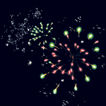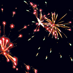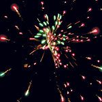 Набор ракет с различными эффектами: четыре разрыва: цветное кольцо, красные звезды, зеленые звезды, трещащая сфера.