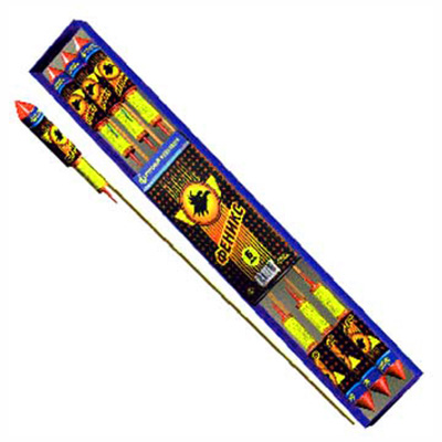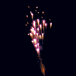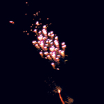 Взлетает со шлейфом, выстреливает синие звезды с треском и хлопком.