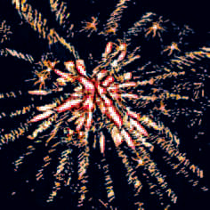 Выстреливает 5 зеленых звезд, разрывающихся красными салютами с серебристыми хвостами и множеством звезд с треском.