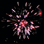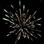 Цветные звезды разрываются цветными сферами с золотыми хвостами.
