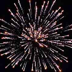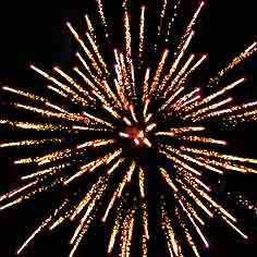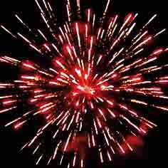 Золотые хвосты и мерцающие, трещащие звезды. Желтые звезды с хвостами и трещащие разрывы. Синие звезды с оранжевыми хвостами. Красные мерцающие звезды и облако трещащих разрывов.