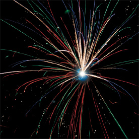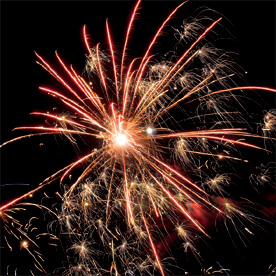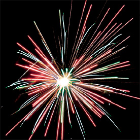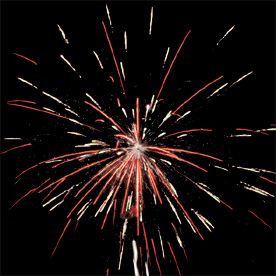 Разноцветные кометы разрываются сферами из: красных и белых мерцающих огней; красных огней с форсами и зеленых огней с форсами; красных, зеленых и синих огней; серебряных форсов, красных огней и множества трещащих сфер.