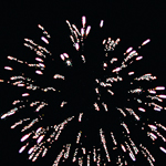 Супер-римская свеча (труба) разрывается сферами из ниспадающих золотых нитей с красными, голубыми и зелеными звездами на концах.