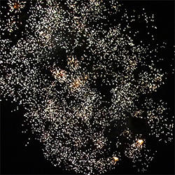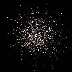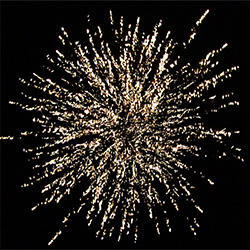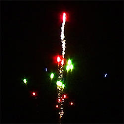 3 эффекта. Разноцветные кометы разрываются сферами из: серебряных форсов с красными огнями на концах, серебряных форсов с зелёными огнями на концах, множества трещащих сфер, на нижнем уровне букет из красных и зелёных огней.