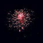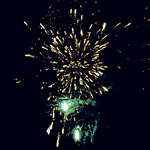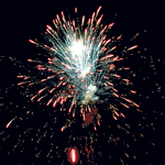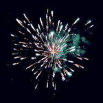 Разноцветные кометы разрываются золотыми хризантемами с красными, зелеными яркими концами на фоне цветных блуждающих звезд.