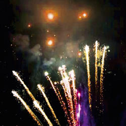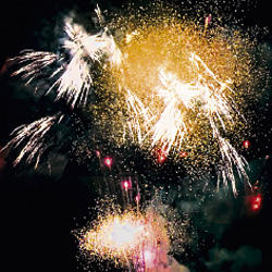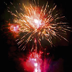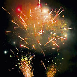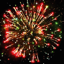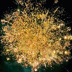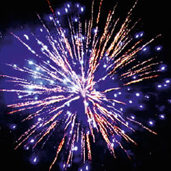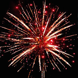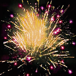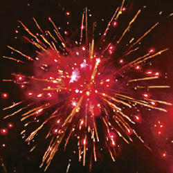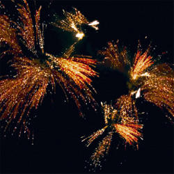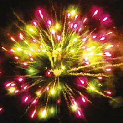 17. Веер W- формы: по сторонам- сноп золотых искр с красно-зелеными огнями, в центре- красные звезды с пышными хвостами (кокос) и треск