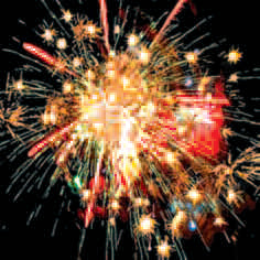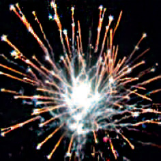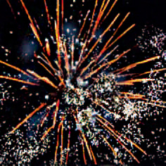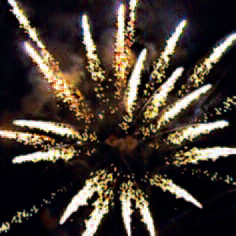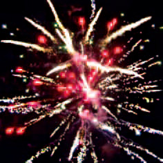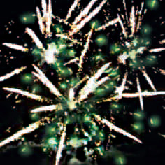 Фейерверк в одной коробке. Белые звезды разрываются цветными звездами с белыми искристыми хвостами и золотыми трещащими облаками. Синяя звезда разрывается синими звездами и облаком золотых трещащих искр. Розовые звезды разрываются белыми мерцающими хвостами. Зеленые звезды разрываются белыми искристыми хвостами, мерцающими зелеными звездами с переходом в белые мерцающие хвосты.