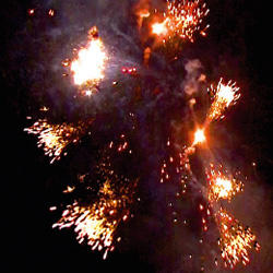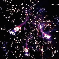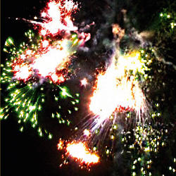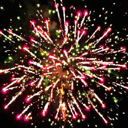 5. Трещащая комета разрывается фиолетовыми звездами с пышными хвостами (кокос), зеленые огни