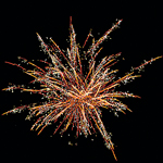 Кометы с мерцающими золотыми звездами разрываются мерцающими золотыми, салютами. Разноцветный мерцающий салют, золотые мерцающие звезды с цветным мерцанием. Множество синих огней.